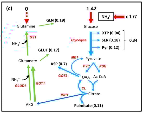 With glucose as carbon substrate (Figure 6b), oxalacetate coming from ATPcitrate lyase (CL) generates malate thanks to the cytosolic malate dehydrogenase (MDH1), oxidizing the glycolytic NADHc as found in [,]. The cytosolic malate re-enters mitochondria through antiporters, particularly in exchange with citrate. It is an elegant way to absorb the cytosolic reductive power of glucose avoiding the operation of MAS. This pathway is often observed when NADH reoxidation is impeded (respiratory complex deficiency for instance). Like with glutamine, there is a cycle involving IDH1 and IDH3 which transforms NADHm into NADPHc (flux = 3.5 in gray in Figure 6b and Figure S6b).