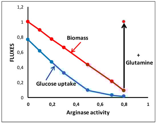 We can show (Figure 9) that increasing the arginase activity while limiting the input of glutamine at the initial level induces a decrease in the biomass by diminishing the availability of arginine. However, glutamine can overcome arginine deficiency by a net arginine synthesis from glutamate conferring resistance to arginine deprivation with “higher glutamate dehydrogenase and glutaminase expression and preferential vulnerability to glutamine inhibitors” [].