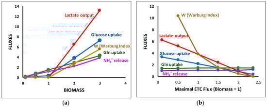 The Warburg effect or aerobic glycolysis is a salient feature of most cancer cells. It is characterized by an increase in glucose uptake and lactate release in the presence of oxygen. To simulate an increase in cell proliferation, we started from the situation of Figure 8a, i.e., a maximum of biomass equal to 1 with free availability of glucose and glutamine and we supposed that this situation corresponds to the maximum capacity of the respiratory chain (ETC flux = 2.374). Then, we simulated an increase of biomass. The solution obtained is represented in Figure 10a. When biomass increased from 1, a massive glucose input was observed that supplements the extra need for ATP. It was accompanied by a massive release of lactate to reoxidize glycolytic NADH, a task that can no longer be provided by the respiratory chain. We also observed an increase of glutamine uptake (accompanied by an increase in NH4+ release) necessary for the biomass increase because the additional glucose carbons were lost with lactate excretion.