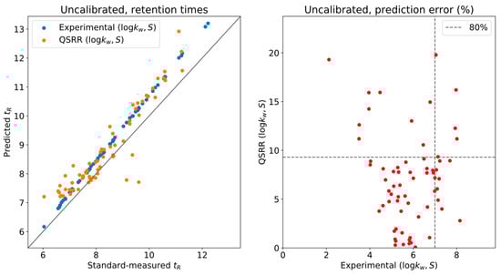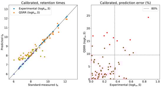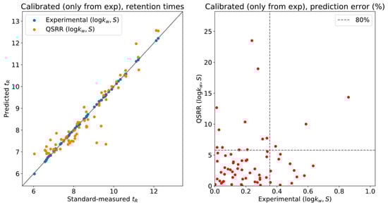 To gauge the effect of QSRR error on the calibration, Figure 3 shows experimental and QSRR predictions, both calibrated using only the experimentally determined LSS parameters. Nearly all the systematic deviation in the QSRR predictions of Figure 2 was corrected, and most of the compounds have less than relative error w.r.t. the actual measurement. This is a reasonable tolerance for level two annotations, although it will provide unique results in only a limited number of situations.