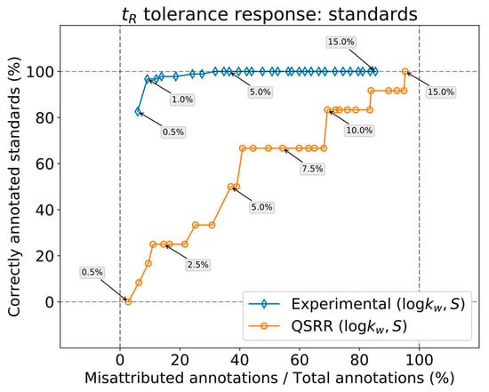 In our previous work, based on preliminary experiments and the literature about the quality of the predictions [7], it was suggested that the tolerance settings for retention times should be and , for experimental and QSRR parameters, respectively. With our analysis, we can go further and optimize these recommended values based on experimental results. Briefly, the findings in the previous section demonstrate that retention time tolerances should be adjusted at and for retention times predicted from experimental and QSRR parameters, respectively. These tolerances were established by regarding how many correct annotations were achieved as a function of the tolerance. To establish a quantitative understanding of the effect of tolerance, we have taken the feature list from the measurement of standard analytes and fed it to DynaStI. Of the available analytes in our mix (see Supplementary material), are listed in the DynaStI database with experimental parameters, and 12 are listed with QSRR. The calibrators and the setup are the same as those in the previous section. Because we know exactly the identity of each feature by using standards, we can compute the rate of successful annotations as