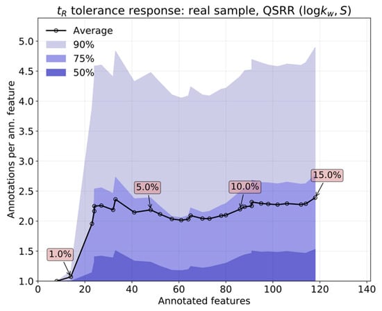 To quantify the annotation multiplicity in a real sample, we plot in Figure 5 the number of QSRR annotations per annotated feature for a range of tolerances, versus the number of annotated features themselves. The main line represents the average over all the features, and the shades represent the , and interpolated percentiles. The percentiles have been estimated with a gamma distribution, as it naturally includes many specific cases of non-negative variable distributions, while still being analytically tractable. At the minimal tolerance of , compounds were annotated with a unique identity. The number of proposals grows quickly as one opens up to , with the worst cases presenting up to putative identities per feature. After , the number of proposals plateaus, and further increases in tolerance mostly add different features to the set of annotations. Notice that approximately half of the features presented only one annotation. This means that we are in the good scenario of potential wrong annotation, as described before. Even if many of these annotations may not include the real identity of the annotated feature, the relatively low number of proposals could be easily confirmed by Supplementary information (e.g., MS/MS).
