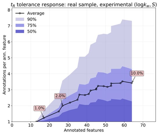 A similar plot is shown in Figure 6 for LSS experimental predictions. In this case, the expected number of annotations per feature is higher than that for QSRR. The library of standards used for the original determination of experimental values contains more isomers than those that are present in the QSRR calculations. Consequently, a maximum value of tolerance should be used, even in real samples.