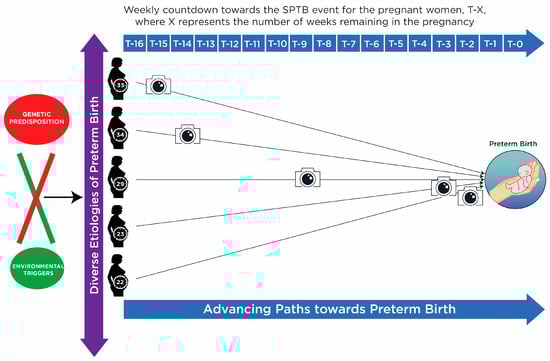 Schema depicting the molecular state of this spontaneous preterm birth (SPTB) dataset at metabolomics sampling time using a representative set of 5 patients. Diverse etiologies leading to SPTB ultimately converge in the final premature birth event. All women in the dataset were sampled at 20 weeks’ gestation, therefore at the same time relative to the start of their pregnancies. However, relative to the preterm birth event, the women were sampled at a variety of time points. For example, women who gave birth at 22 weeks were sampled at T-2 weeks and women who gave birth at 35 weeks were sampled at T-15 weeks. Snapshots (depicted by camera icons) of metabolomic activity taken at different stages preceding the SPTB even will be more divergent the further they are from the event.