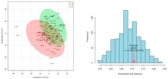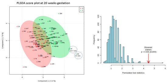 PLSDA analysis was carried out on pretreated and imputed data using Metaboanalyst 4.0. A 2000 times permutation assessed the validity of the model. The results of the permutation test on the 15-week dataset (p = 0.383) showed that the model produced by PLSDA was invalid (Figure 2) so therefore selecting features on the basis of this model is unreliable. Biologically, this makes sense, as the pathway to SPTB may not have gotten under way yet at 15 weeks gestational age in many of the cases.