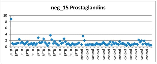 As can be seen in the diagram (Figure 1), ultimately all pathways to SPTB eventually converge in the event of preterm birth. However, the sample timing leads to a variety of time-to-events ranging from 2 weeks to 16 weeks which results in the metabolomic snapshot being taken at various times in the disease process, or in some instances possibly before the disease process has commenced, at a metabolomic level at least. Intuitively this means that it is likely that the metabolomic snapshot has been taken at various points in the different etiological pathways resulting in a variety of differential features relative to controls. Therefore, there was little expectation of discovering a “signature” for SPTB that would be common to all or most cases, from this dataset. The expectation was that any biomarker candidates that were to be found in this dataset would represent some but not all cases, with a view to these candidates potentially contributing towards a combinatorial panel.