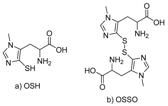 Finding of OSH in millimolar concentrations in the fish lens changes the modern conception of redox processes occurring in the lens. The concentration of OSH in the fish lens is much higher than that of GSH, and the rates of OSH reactions with reactive oxygen species (ROS) are higher [3,6,10,24]. That means that in the fish lens, OSH represents the first line of the cellular defense against oxidative stress. At the same time, it is known that the equilibrium in the Equation (1)
