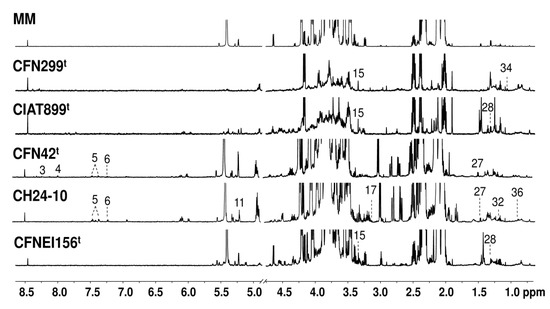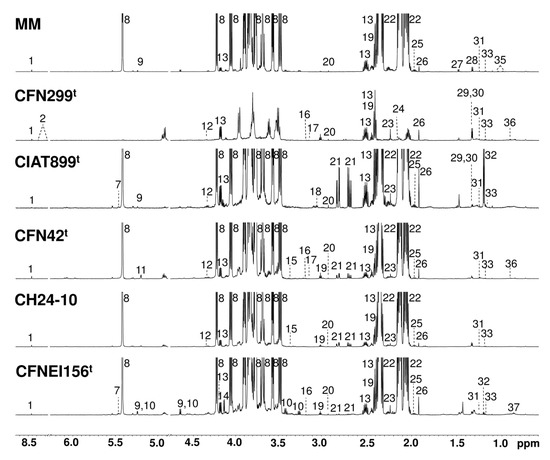 - Palama, T.L.; Canard, I.; Rautureau, G.J.; Mirande, C.; Chatellier, S.; Elena-Herrmann, B. Identification of bacterial species by untargeted NMR spectroscopy of the exo-metabolome. Analyst 2016, 141, 4558–4561. [Google Scholar] [CrossRef]