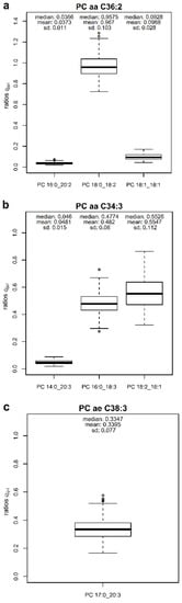 For 38 (25 PC aa and 13 PC ae) out of the 68 PC sums quantified with the AbsoluteIDQTM p150 kit, in total, 69 respective PCs of the fatty acid level (LipidyzerTM) were available at sufficient coverage (25%) in the HuMet Study [] to estimate quantitative compositions. Each PC sum (lipid species level) consists of one to four measured PCs of the fatty acid level, e.g., PC aa C36:2 = PC 16:0_20:2 + PC 18:0_18:2 + PC 18:1_18:1 + R, PC aa C34:3 = PC 14:0_20:3 + PC 16:0_18:3 + PC 18:2_16:1 + R, or PC aa C32:2 = PC 14:0_18:2 + R (Table S2). Here, R corresponds to the sum of respective non-measured PCs of the fatty acid level that are specified in Table S1. In the following, we use the fatty acid level of the shorthand notation of lipids for PCs, e.g., PC x1:y1_x2:y2 according to the resolution of the LipidyzerTM technique []. PCs of the lipid species level are labeled according to the Biocrates-specific notation, e.g., PC aa Cx:y or PC ae Cx:y, corresponding to PC x:y or PC O-x:y although the measurement did not allow differentiation of PCs on the bond type level; PC aa or PC ae labels were chosen under the assumption of even chain lengths of fatty acids.