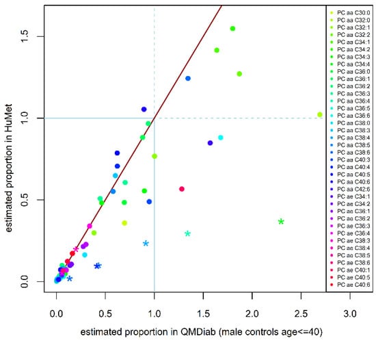 Comparison of characteristic proportions in Human Metabolome (HuMet) study and Qatar Metabolomics Study on Diabetes (QMDiab). On average, proportions tend to be slightly higher in QMDiab than respective proportions in HuMet. The blue lines indicate the threshold where the concentration of the PC constituent measured on the LipidyzerTM platform was higher than the respective containing PC sum measured with AbsoluteIDQTM p150 kit. PCs of the fatty acid level that contain C20:4 as one of their lipid side-chains are shown as asterisk.