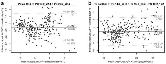 Deviation and mean of PCs of the lipid species level and sum of respective (measured) PCs of the fatty acid level. The Bland–Altman plots show the relative deviation of PC sums (measured on the lipid species level) and the sum of the respective PC constituents (measured on the fatty acid level) dependent on the mean of concentrations. (a) In 19 of 25 PC aa measures the mean difference was within 2 SD of the concentration of the PC of the lipid species level. PC aa C40:4 is one example out of 12 of these 19 PC aa, for which the mean difference to its corresponding sum of measured PCs of the fatty acid level (PC 18:0_22:4 + PC 20:0_20:4) was within 1 SD. (b) For 10 PC aa, mean differences between the PC sum and the sum of concentrations of PCs of the fatty acid level were negative, i.e., the sum of the components exceeded the concentration measured as PC aa using the AbsoluteIDQTM kit as shown for the example of PC aa C34:3.