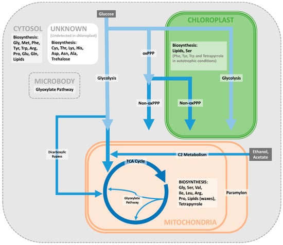There is no doubt that E. gracilis is an interesting organism in terms of its evolution, metabolic capacity, and application and has thus been the subject of intense study. Due to its extraordinary metabolic capacity, investigating and understanding the Euglena metabolic network could help expand the applications of this organism and shed light on several mysteries of evolution and secondary endosymbiosis. Investigation of the metabolism of Euglena requires the definition of the metabolic network, whether at genome scale for flux balance analysis, or at the level of core metabolism for metabolic flux analysis. This would allow the metabolic phenotype of the organism to be investigated in much the same way as in highly compartmented plant cells []. In organisms with complex evolution like Euglena, even though the central metabolic pathways are conserved, the characteristics and subcellular localisation of the enzymes involved in the pathway can differ. This is particularly true for Euglena, where the secondary chloroplast has a relatively recent evolutionary origin (~600 MYA []) and a unique third plastid membrane, giving rise to a novel subcellular compartment in this intermembrane space.