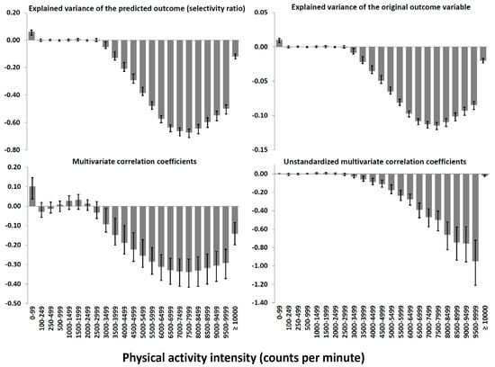 SR and alternative statistics. The SR was developed as a statistic to separate important from less important information in mass spectral profiles acquired from cerebro-spinal fluid samples. The profiles were described by several thousands of mass-to-charge (m/z) intensities [,], measured as counts similar to accelerometry data. Thus, the development of SR was motivated by a need to highlight the signals with strongest associations to the outcome variable(s) after taking into account the noise level in the data. This measure, however, might be less informative for PA researchers and less directly interpretable compared to more common measures of association or effect size. The choice of statistic and its calculation and visualization is a matter of purpose. From the originally developed SR, given as the ratio of the explained to residual variance related to the target-projected component [,], several alternative statistics can be derived. In the present paper, we present four different alternatives: (1) Instead of dividing by the residual variance, we divided by the total variance, giving a measure of explained variance of each single explanatory variable, in a multivariate space, related to the target-projected component. This measure has a range of −1 to 1 when multiplying with the sign of the variable in the target-projected component. (2) Further, instead of relating this variance solely to the target projected component (i.e., the total explained variance related to the predicted outcome), we report a modified SR as the explained variance of the original outcome variable: SR * explained variance in the outcome. This statistic, thus, provides the explained variance of each of the explanatory PA variables for the actually measured outcome (instead of the predicted outcome). (3) Furthermore, by calculating the squared root of this statistic, we derived “multivariate correlation coefficients”, which are comparable to Pearson’s bivariate correlation coefficients (r), except that they are derived from the modelled part of the multivariate space. (4) As correlation coefficients are standardized to 1 SD, we finally weighted this correlation coefficient by each variable’s SD to obtain “unstandardized multivariate correlation coefficients” or coefficients of covariance. Thus, the statistics derived in step 3 and 4 are analogous to, but different from, standardized and unstandardized regression coefficients in linear regression. Using the latter (unstandardized) statistic allows for comparison of PA intensities’ importance for the outcome using actual units, that is, minutes per day. However, since the target projected component does not include so-called orthogonal variation among the explanatory variables and the outcome, these unstandardized multivariate correlation coefficients cannot be used directly for prediction of the outcome. For the purpose of prediction, the orthogonal variation needs to be accounted for in the model. Thus, the unstandardized multivariate correlation coefficients differ from regression coefficients.