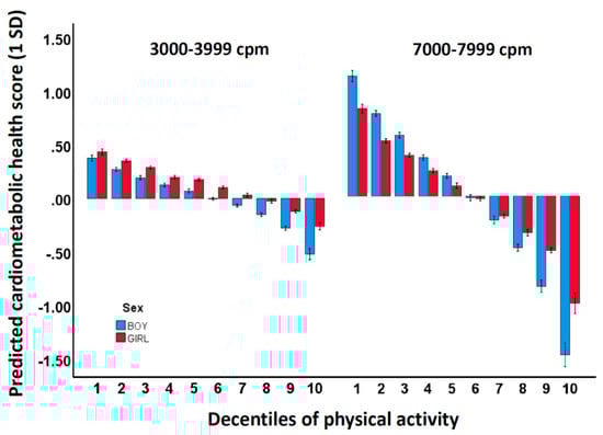 Interpretation of multivariate pattern models. Since multivariate pattern analysis provides the association pattern—the signature—of how the explanatory variables in a multivariate space relate to the outcome, explanatory variables are not independent of each other. Thus, their separate association with the outcome cannot be determined from this analysis, which is reasonable given their strong interrelationships []. Furthermore, since time spent in each PA intensity replaces time spent in others, a meaningful interpretation must also incorporate reallocation of time as a basis for interpretation []. To illustrate this concept, we performed an analysis based on prediction of change in the composite cardiometabolic health score across sex-specific decentiles of PA using unstandardized multivariate correlation coefficients (covariances). As explained above, this measure provides the association with the composite score per 1 min/day change in a given intensity. For ease of interpretation, we merged PA intensities into the following 12 categories for this analysis: 0–99, 100–999, 1000–1999, 2000–2999, 3000–3999, 4000–4999, 5000–5999, 6000–6999, 7000–7999, 8000–8999, 9000–9999, and ≥10000 cpm. Boys and girls were separately categorized according to their age- and wear time-adjusted decentiles of time spent in the VPA intensity strongest related to cardiometabolic health (7000–7999 cpm) and a typical MPA (3000–3999 cpm) (40–43 children per group). These results are shown as the predicted changes in the cardiometabolic score according to each decentile group’s time spent in these intensity levels. To further simplify the understanding of patterns of change in PA across decentiles, we also summed time spent in 2000–3999 cpm and ≥4000 cpm for all decentiles, which roughly corresponds to the Evenson cut points [] of MPA and VPA. Importantly though, since we show time use across intensities per 1000 cpm, any combination of intensities can be summed.