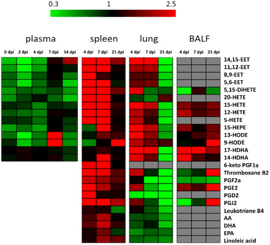 Heatmap displaying fold changes (infection/control) of all measured eicosanoid amounts of all sample types and time points. Decreased levels are shown in green, increased amounts in red and comparable amounts in black. Grey fields: below detection limit.