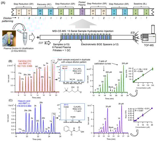 Multiplexed separations based on MSI-CE-MS offer a high throughput platform for biomarker discovery in metabolomics that is optimal for analysis of mass or volume-restricted biological specimens ranging from dried blood spot punches, infant sweat specimens to skeletal muscle tissue biopsies [,,,]. Major improvements in sample throughput are achieved without added infrastructure costs or complicated column switching programs, which allows for stringent quality control (QC) and batch correction []. To date, previous studies have employed a serial hydrodynamic injection of discrete sample plugs (i.e., typically seven) between alternating segments of background electrolyte (BGE) within a single experimental run []. In this work, we implemented a modified serial injection format in MSI-CE-MS, comprising of 13 plasma filtrate samples when using electrokinetic BGE spacers in order to further boost sample throughput (<3 min/sample), separation resolution and peak capacity as compared to conventional single injection separations. This process initiates zonal electrophoretic separation of ions and their isomers/isobars immediately after each sample injection and thus, takes advantage of the total effective capillary length as shown in Figure 1A. Novel experimental workflows can be designed in MSI-CE-MS via customized, serial injection configurations that is effective for metabolite authentication when performing non-targeted profiling in order to reject a plethora of background or redundant signals (e.g., in-source fragments, isotope signals, adduct ions) generated in ESI-MS [,]. For example, a randomized injection of plasma filtrate samples from each participant was analyzed in duplicate with a distinct dilution pattern (1:2, 1:1, 2:1) to encode sample position information reflecting the study design of the experiment (Figure 1B). Each run in MSI-CE-MS also includes a pooled QC and/or blank filtrate to assess technical precision and potential sample carry-over between injections, respectively. Each ion was annotated based on its characteristic accurate mass and relative migration time (m/z:RMT) under positive (+) or negative (-) ion mode detection with putative identification (level 2) based on its most likely molecular formula using high resolution MS as shown in extracted ion electropherograms for representative cationic (Figure 1B) and anionic (Figure 1C) plasma metabolites, such as carnitine (162.112:0.666 as [M+H]+) and hippuric acid (178.051:0.880 as [M-H]−). Unambiguous identification of plasma metabolites (level 1) was then achieved based on their co-migration and MS/MS spectral match when compared to an authentic standard based on recommended guidelines from the Metabolomics Standards Initiative [,]. Once identified, a different injection format in MSI-CE-MS was used to acquire calibration curves for metabolite quantification in plasma samples as shown for a series of calibrant solutions for carnitine and hippuric acid under positive and negative ion modes, respectively (Figure 1B,C).