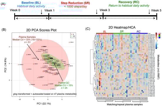 This study was based on a previously published study where 22 older adults (12 men, 10 women) were recruited to undergo an acute step reduction intervention []. However, only 17 (10 men, 7 women) of the 22 participants were included in our study due to lack of plasma specimens available at each time point. Prior to the intervention, participants were screened to ensure they met the inclusion criteria (i.e., non-smoking, free from chronic disease, moderately active, did not consume nonsteroidal anti-inflammatory drugs or medication for cholesterol management). The study protocol was approved by the Hamilton Integrated Research Board (REB #14-609). First, participants underwent 7 days of monitored normal physical activity (baseline; BL). Thereafter, participants underwent two weeks of step reduction (SR, <1000 steps per day) followed by return to habitual physical activity for two weeks during recovery (RC). Daily step count was monitored using a hip-placed pedometer unit (Piezo SC-StepX Health System, StepsCount, Deep River, ON, Canada), which was internally validated with a SenseWear arm band accelerometer (BodyMedia, Pittsburg, PA, USA). During the last three days of each intervention period (BL, SR and RC), participants were provided with standardized meals (55% carbohydrate (CHO), 30% fat and 15% protein) in the form of flash frozen, prepackaged foods (Heart to Home, Hamilton, ON, Canada). Furthermore, at the end of each intervention period (BL, SR and RC), participants also performed an oral glucose tolerance test (OGTT) following a 10 h overnight fast where blood samples were obtained via an intravenous catheter inserted into an antecubital vein. After collection, blood samples were centrifuged at 4000× g for 10 min at 4 °C. Afterwards, all plasma samples were stored at −80 °C prior to further preparation for metabolomics analysis.