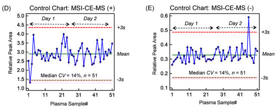 Figure 2A depicts the overall study design which included repeat fasting plasma samples collected at three time intervals for each participant at baseline, after two weeks of step reduction and following recovery when resuming normal ambulatory activity for another two week period. Stringent selection criteria were applied when performing nontargeted metabolite profiling of plasma in order to reduce bias and false discoveries as described elsewhere [,]. Briefly, after initial metabolite authentication and identification when using a dilution trend filter on a pooled plasma sample, only frequently detected plasma metabolites measured in the majority of samples in this cohort (>75%) with acceptable technical precision based on repeated analysis of QCs (mean CV < 30%, n = 25) were included in the final data matrix. Overall, a total of 47 polar/ionic metabolites from plasma satisfied these selection criteria with most metabolites identified with authentic standards (level 1), including circulating amino acids, acylcarnitines, biogenic amines, organic acids and various secondary metabolites as their glucuronide, glycine or sulfate conjugates (Table S1 of Supporting Information). As expected, the biological variance of the plasma metabolome was considerably larger (median CV = 33%, n = 51) as compared to the technical precision of QCs (median CV = 15%, n = 25) as shown in the 2D scores plots from a principal component analysis (PCA) in Figure 2B. A 2D heat map with hierarchical cluster analysis (HCA) summarizes the overall data structure involving 47 plasma metabolites denoted by their m/z:RMT consistently measured in the majority of participants at three time points in this study. In all cases, average ion responses for metabolites in MSI-CE-MS were normalized to an internal standard from the same injection position to correct for variations in injection volume on-capillary []. Also, control charts for the recovery standard (10 μM 4-fluorophenylalanine, F-Phe) added to all thawed plasma samples prior to ultrafiltration further confirm acceptable intermediate precision (median CV = 14%, n = 51) based on its normalized ion response measured in (D) positive ion mode using 3-chlorotyrosine (Cl-Tyr) and (E) negative ion mode using naphthalene monosulfonic acid (NMS) as internal standards with few outliers that exceeded warning limits. As there was no evidence of long-term signal drift or systematic error, application of a QC-based batch correction algorithm was not deemed necessary unlike long-term/intermittent studies performed on shared instrumentation following service repairs and/or relocation []. As a result, MSI-CE-MS offers a rapid metabolomics platform for reliable metabolite quantification when relying on customized serial injections that encode mass spectral information temporally in a separation with stringent QC.