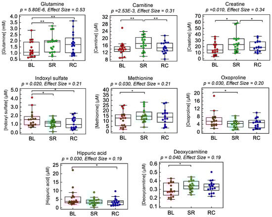 Box-whisker plots illustrating dynamic changes among eight top-ranked plasma metabolites modulated after two weeks of step reduction (SR) with a subsequent two week recovery (RC) period to normal physical activity as compared to baseline (BL) in a cohort of older pre-diabetic adults (n = 17). A repeated measures one-way ANOVA test was performed to identify significant changes in circulating metabolite concentrations as summarized in Table 2, where a bracket represents a significant pairwise comparison (* p < 0.05; ** q < 0.05). Overall, these plasma metabolites reflect adaptive metabolic responses to physical inactivity/muscle disuse from step reduction that did not fully recover after resuming normal habitual physical activity.
