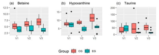 Boxplots for top-ranked metabolites (concentrations shown as mmol/mol creatinine). (a) Betaine (EG: n = 9, CG: n = 7); (b) Hypoxanthine (EG: n = 10, CG: n = 8); (c) Taurine (EG: n = 10, CG: n = 7); CG: Control Group, EG: Experimental Group, p: p-value, V1: Visit 1 (day before the training started), V2: Visit 2 (day after the the last training session), V3: Visit 3 (after four days of recovery); metabolites were chosen as top-ranked if at least one p-value was lower than 0.01.