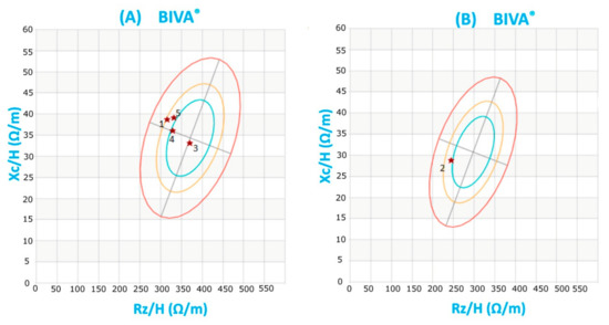 Subjects’ Bioelectrical Impedance Vector Analysis (BIVA): The graphical representation (R-Xcgraph) known as BiaVector® represents resistance (Rz) and reactance (Xc) normalized by height. Rz and Xc were measured at 50 kHz. The three concentric ellipses, proceeding from the center towards the periphery of the graph, represent the 50th, 75th and 95th percentiles of the BIVA distribution in a reference population. Each subject was plotted in the R-Xcgraph. BIVA shows that all subjects fall within the 75th percentile ellipse for the reference population, (A) females and (B) males, demonstrating the absence of significant hydration and body composition abnormalities.