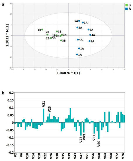 (a) Orthogonal partial least-squares-discriminant analysis (OPLS-DA) scores plot. Postprandial urines with (A) and without (B) blueberries of five patients two and four hours after intake. R2Xcum = 0.304 (fraction of variance cumulative in the X matrix), R2Ycum =1.0 (fraction of cumulative variance in the Y matrix); (b) coefficients plot of the 75 variables from 1H-NMR spectra.