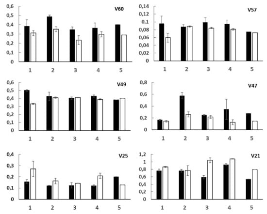 Histograms relative to the mean values (after 2 and 4 h) of bin variables selected by ANOVA analysis for five patients (1, 2, 3, 4, 5). Black and white bars are due to meals without and with blueberries, respectively. Standard errors are also reported.