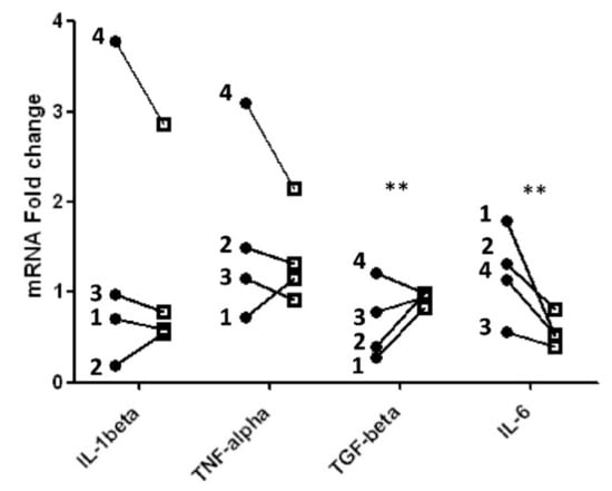 mRNAs for pro-inflammatory cytokines, including Interleukin (IL)-1β, IL-6, Tumor Necrosis Factor (TNF) -α, and for anti-inflammatory cytokines, including IL-4, IL-10 and Transforming Growth Factor (TGF)-β obtained from blood mononuclear cells, were analyzed by real-time PCR.