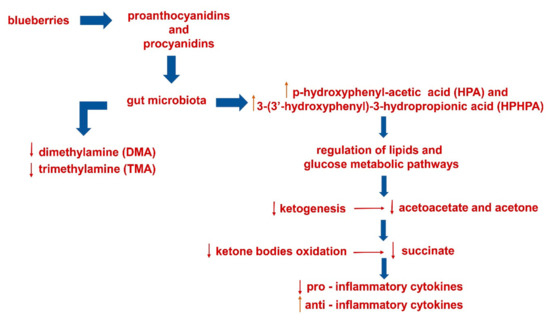 Furthermore, the mechanisms underlying blueberry effects, such as reduction of oxidative stress and inflammation, improvement of endothelial dysfunction, regulation of cholesterol accumulation and trafficking, along with potentially influence of gut microbiota, were discussed in a recent review showing the health benefits related to blueberries consumption [64].