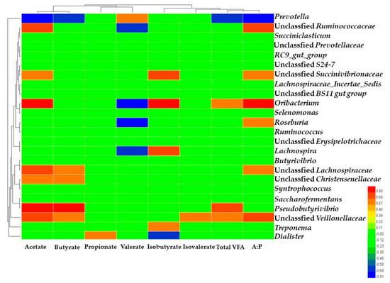 Correlations between ruminal VFA parameters and the relative abundance of microbiota were calculated using Spearman’s correlation test implemented in XLStat (Addinsoft, Paris, France). Heml 1.0.3.3 (Heatmap Illustrator) software was used to visualize the correlation that had a correlation coefficient absolute value greater than 0.60 and significance less than 0.05.