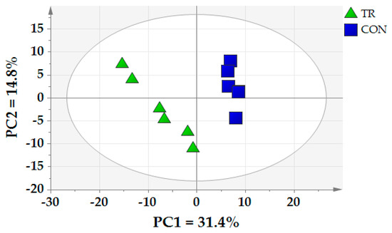 Principal component analysis (PCA) of ruminal metabolites of CON and TR groups. PC1 = the first principal component; PC2 = the second principal component.