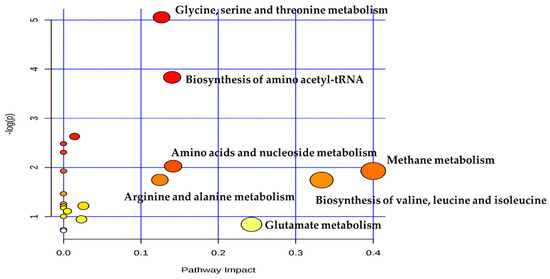To provide a comprehensive view of the DMs between dairy cows with MFD and the controls, pathway analysis was conducted (Figure 5). Results revealed that glycine, serine and threonine metabolism; biosynthesis of amino-acetyl-tRNA; methane metabolism; amino acids and nucleoside metabolism; arginine and alanine metabolism; glutamate metabolism were significantly enriched (FDR < 0.05) in TR group compared with CON group.