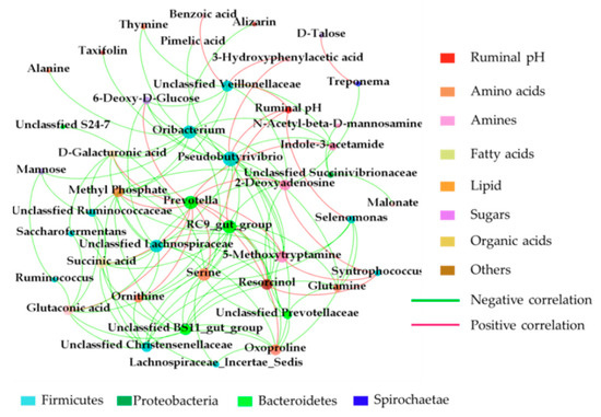 Correlation networks were constructed by means of the data concerning the most abundant taxa (relative abundance of ≥ 0.01%) and DMs (VIP >1 and FDR < 0.05) created on Spearman correlation coefficients (|r| > 0.75 and P < 0.05) in CON and TR groups (Figure 6). We observed that the top 5 high negative correlations were between the unclassified BS11_gut_group and serine; the RC9_gut_group and oxyproline; Oribacterium and indole-3-acetamide; the RC9_gut_group and 5-methoxytryptamine; the unclassified Lachnospiraceae and glutaconic acid. The top 5 high positive correlations were between Treponema and d-talose; the unclassified Veillonellaceae and 3-hydroxyphenylacetic acid; the Prevotella and methyl phosphate; the Prevotella and succinic acid; the Prevotella and glutaconic acid. The main bacteria were Prevotella, Syntrophococcus, unclassified Veillonellaceae Oribacterium, unclassified Lachnospiraceae, RC9_gut_group and unclassified BS11_gut_group which belong to Bacteroidetes and Firmicutes; the main metabolites were amines (indole-3-acetamide and 5-methoxytryptamine), amino acids (serine and oxoproline), dicarboxylic acid (glutaconic acid), organic acid (succinic acid) and sugars (d-talose). In addition, alanine was negatively (r = −0.866; P = 0.021) correlated with the Oribacterium.