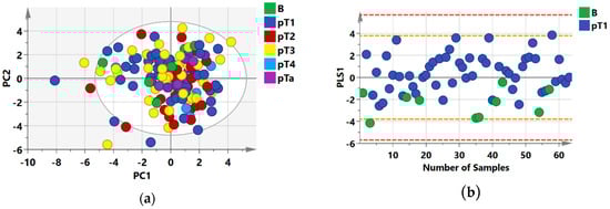 An unsupervised PCA model was first built for the whole data set which showed no distinct separation between the (Benign, pT1, pT2, pT3 and pT4) groups (Figure 1a). Seven outliers (three of the pT1 group, two of the pT2 group and two of the pT3 group) which were samples located outside the Hotellings T2 ellipse of the PCA model were identified and excluded from further analyses (Figure 1b–e). Nevertheless, the R2Y and Q2 metrics were comparable before and after outlier exclusion.