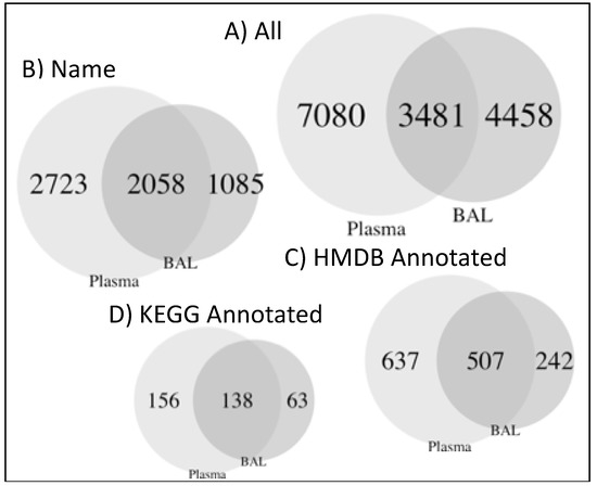 Compilation of Venn diagrams for bronchoalveolar lavage (BAL) and plasma compounds. All compounds (A), only annotated compounds (B), or annotated compounds with identifiers in HMDB (C), or KEGG (D) databases.