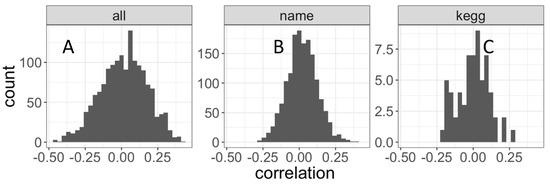 BAL and Plasma comparison using distribution of Pearson’s correlation between BAL and plasma. All compounds (left), only annotated compounds (middle), or annotated compounds with KEGG identifiers (right). Mean correlation and t-test p-values are mean = 0.015, P = 1.7 × 10−4 (A), mean = 0.021, P = 4.7 × 10−15 (B) and mean = 1.1 × 10×, P = 0.94 (C). The set of all compounds passing the <20% missingness preprocessing filter and annotated with HMDB identifiers was equivalent to the corresponding KEGG set, and no separate distribution for HMDB is shown.