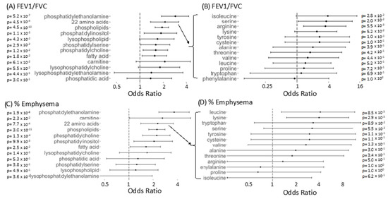 Enrichment of compound classes in BAL compounds associated with FEV1/FVC and % Emphysema). (A) Odds ratio with 95% confidence intervals for compounds in a given category to appear among the FDR corrected FEV1/FVC associated compounds versus appearing among non-associated compounds, using Fisher’s exact test. Regular expression searches identified compounds of different categories with matching compounds checked manually for accurate categorization. (B) Same as A (top left) but for more specific amino acid containing compounds. Categories shown in B include amino acid containing compounds for amino acids with >10 compounds detected experiment-wide for BAL. In B, a compound need only contain the compound listed to be included. (C) Same as A for % Emphysema (D) Same as B for % Emphysema
