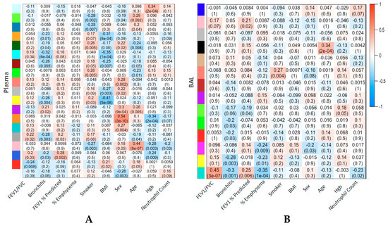 Strength of correlation between weighted gene co-expression network analysis (WGCNA) modules and clinical variables and outcomes. Heatmap of module/clinical variable correlation. Plasma (A) or BAL (B). Module colors correspond to dendrogram in Figure S2. Cell text is Pearson correlation (p-value) between the first principal component representing the module and the corresponding variable. Plasma WGCNA modules without any correlation, p-values <0.01, are excluded (12 excluded, 19 displayed) for greater visual clarity. Full plasma WGCNA module to clinical variable correlations are shown in Figure S5.