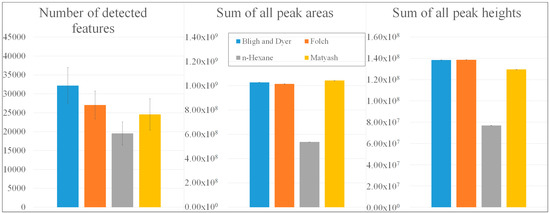 Comparison of extraction procedures according to Bligh and Dyer [22], Folch [23], Reis using n-hexane [25], and Matyash [24] with regard to the number of detected mass features, the sum of all peak areas, and the sum of all peak heights.