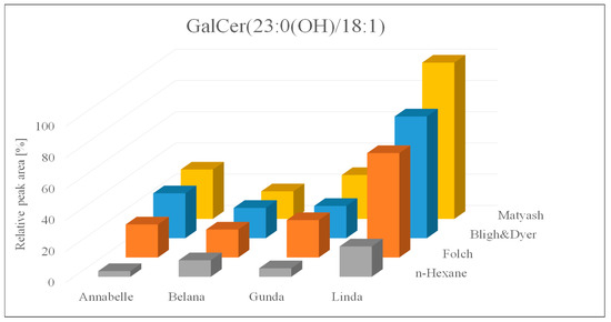 Apart from the comparison of extraction yields and procedures, the sample set was evaluated with regard to varietal differences. Subsequently, three extraction replicates of each variety, analyzed twice per extraction procedure, were considered, indicating significant varietal difference across all four investigated approaches. This varietal interrelation regardless of the evaluated procedure was summarized exemplarily for GalCer (23:0(OH)/18:1) in Figure 2.