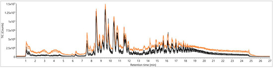 Comparison of total ion chromatograms (TICs) from a quality control (QC) sample according to Folch [23] for signal stability over five days: first five injections (orange) versus the last five (injections 240–260, black).