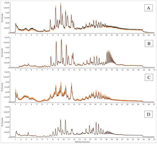 Comparison of TICs from a QC sample according to Folch [23] for signal stability over 2.5 days using different analysis parameters (desolvation temperature and gas flow, removal of injection peak, electrospray ionization source (ESI) probe angles): (A) 823.15 K, 1000 L/h, ESI probe angle position 7; (B) 823.15 K, 1000 L/h, ESI probe angle position 7, waste until 1.5 min; (C) 823.15 K, 1000 L/h, ESI probe angle position 8.5; (D) 703.15 K, 800 L/h, ESI probe angle position 7; first five injections (orange) versus the last five (injections 126–130, black).