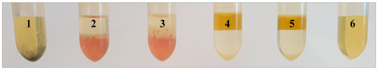 Comparison of QC samples extracted according to Folch (2 and 3) with QC samples extracted using ethyl acetate (EtOAc) (“green” Folch, 4 and 5) with regard to their starch content after centrifugation and filtration (starch detection with Lugol´s solution containing potassium iodide and iodine); 1: positive control sample, 6: negative control sample.