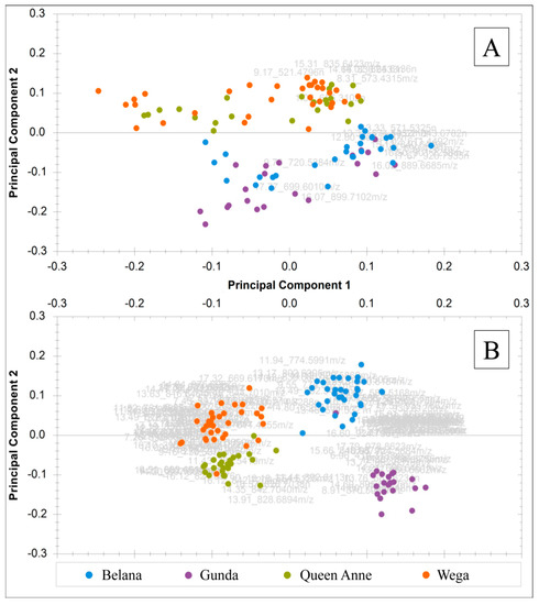 Combined principal component analysis (PCA) score and loading plots (bi-plots) of authentic potato samples displaying principal component 1 versus principal component 2: (A) samples extracted according to the Folch method using 19 filtered mass features with PC-1 36.07% and PC-2 23.95%; (B) samples extracted with EtOAc using 112 filtered mass features with PC-1 41.06% and PC-2 15.74%.