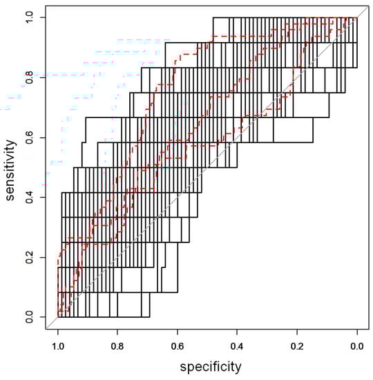 ROC curve for the COPSAC2010 dataset. In the plot, the 100 ROC curves calculated during the projection to latent structures discriminant analysis based on variable influence on projection selection (VIP-based PLS-DA) stability selection procedure for the COPSAC2010 dataset are reported, represented by the black lines. Red, dashed lines indicate the 10th, 50th, and 90th percentiles.
