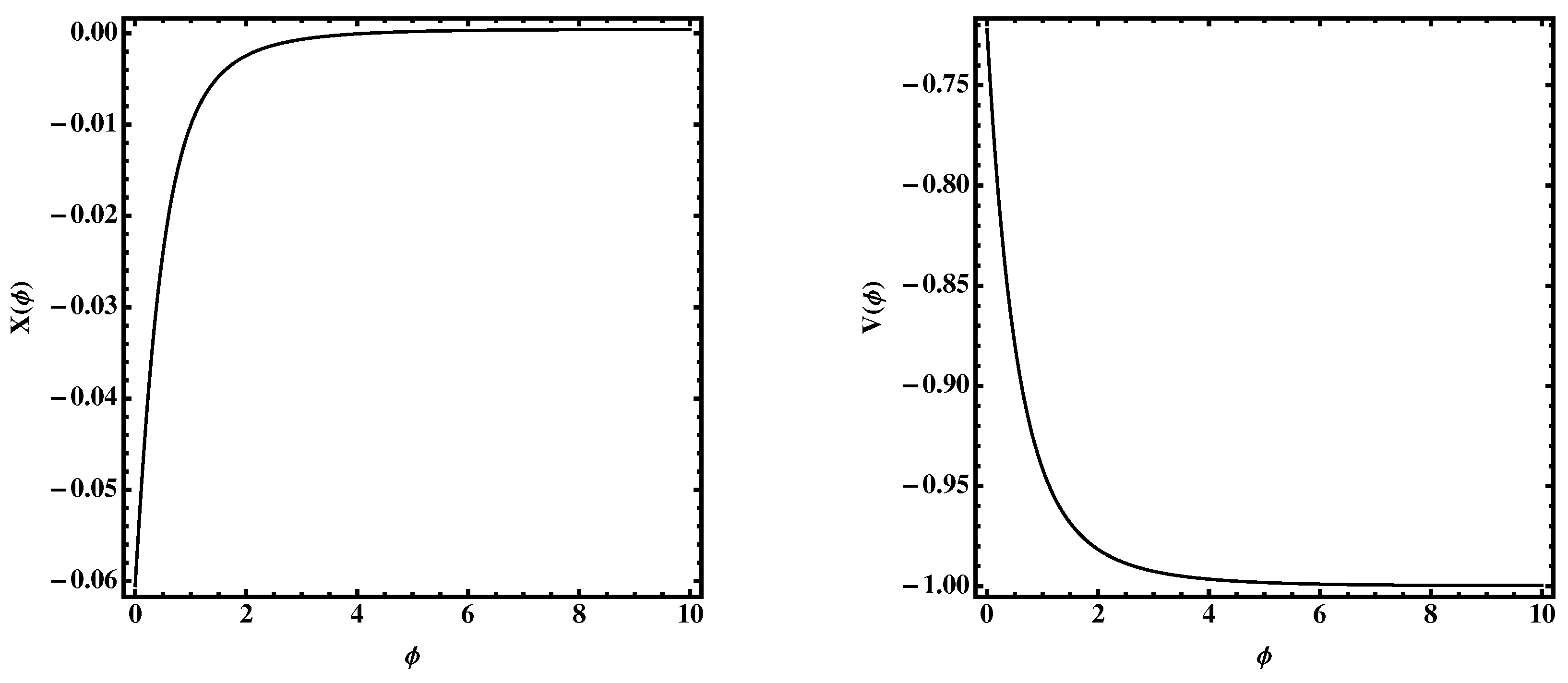 The kinetic term (left panel) and scalar potential (right panel) for the ΛCDM model Equation (32) with .
