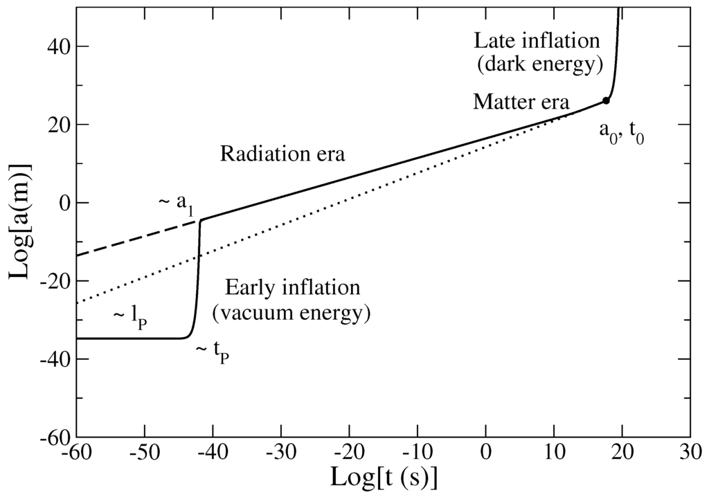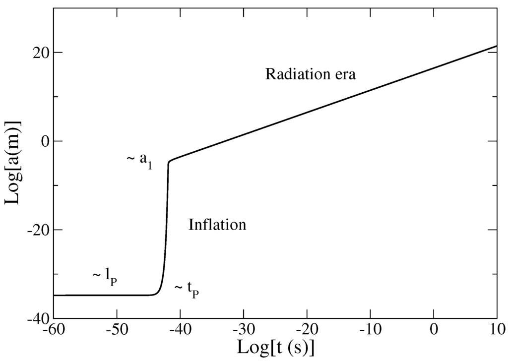 Evolution of the scale factor a with the time t in logarithmic scales. This figure clearly shows the phase of inflation connecting the vacuum energy era to the α-era (representing here the radiation era). During the inflation, the scale factor increases exponentially rapidly on a timescale of the order of the Planck time (for it increases by 29 orders of magnitude in less than s). In the α-era, the scale factor increases algebraically as .