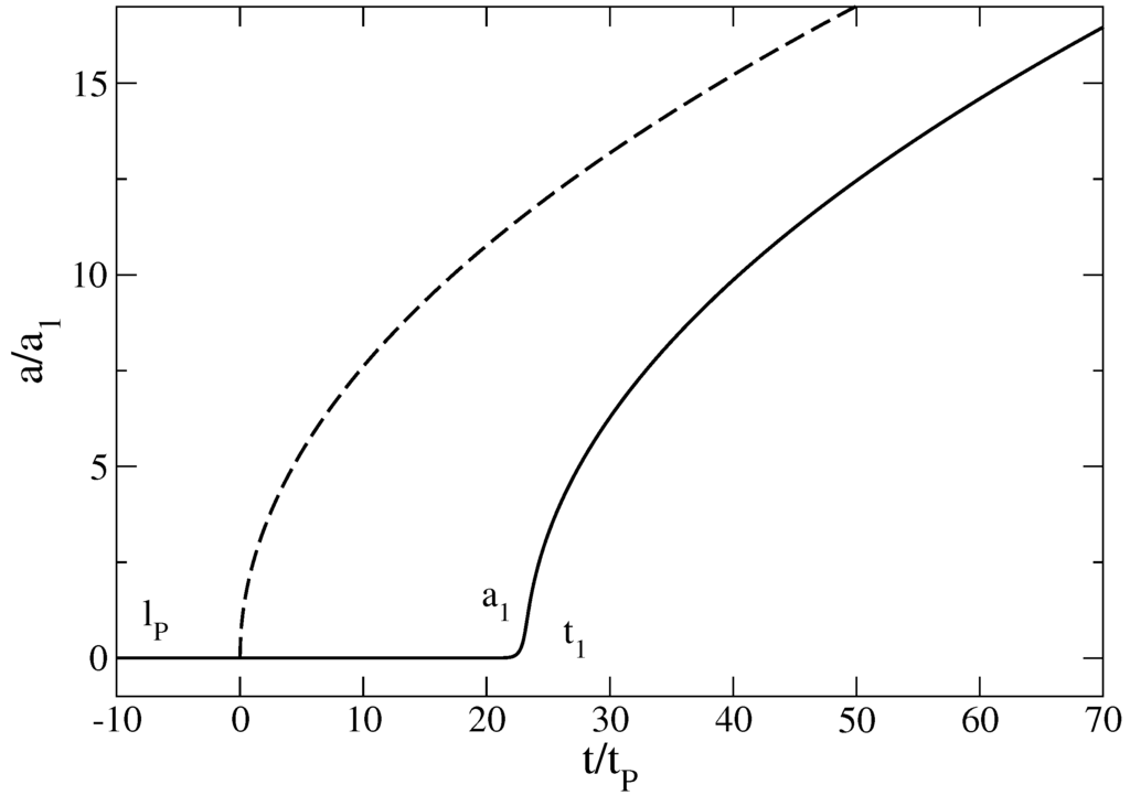 The timescale of the exponential growth is the Planck time . We have defined the “original” time such that is equal to the Planck length . Mathematically speaking, the universe exists at any time in the past ( and for ), so there is no primordial singularity (Big Bang). However, when , we cannot ignore the quantum fluctuations associated with the spacetime. In that case, we cannot use the classical Einstein equations anymore and a theory of quantum gravity is required. It is not known whether quantum gravity will remove, or not, the primordial singularity. Therefore, we cannot extrapolate the solution in Equation (24) to the infinite past. However, this solution may provide a semi-classical description of the phase of early inflation when .