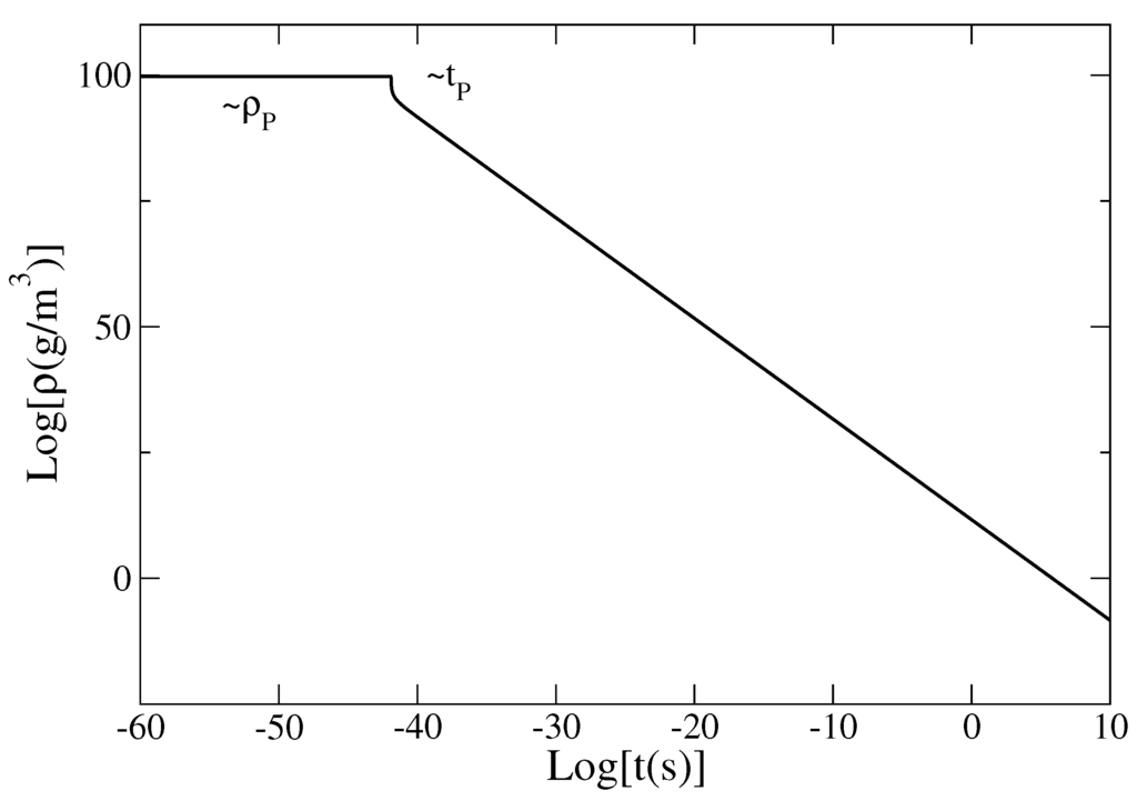 Evolution of the density ρ with the time t in logarithmic scales. During the inflation, the density remains approximately constant with the Planck value which represents an upper bound. In the α-era, ρ decreases algebraically as .