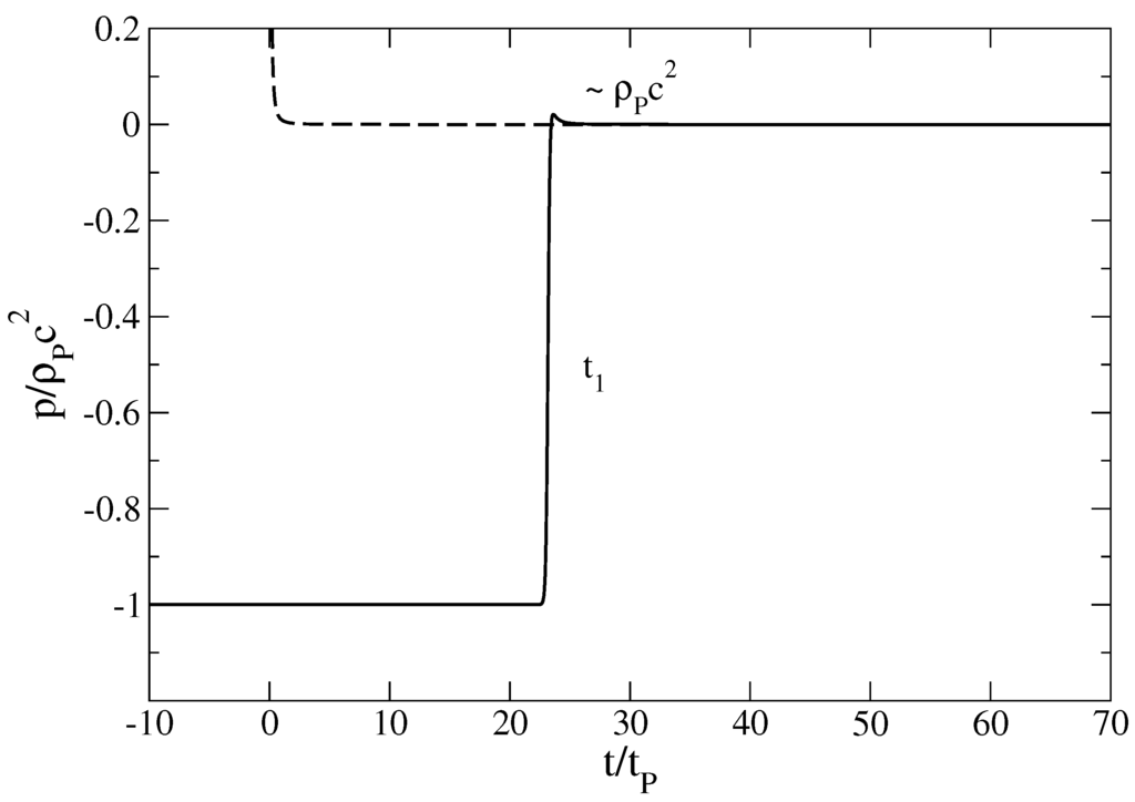 and the pressure tends to . The Planck density (vacuum energy) represents a fundamental upper bound for the density. A constant value of the density gives rise to a phase of early inflation. From the Friedmann equation (12), we find that the Hubble parameter is constant, , where we have introduced the Planck time . Numerically, . Therefore, for , the scale factor increases exponentially rapidly with time as